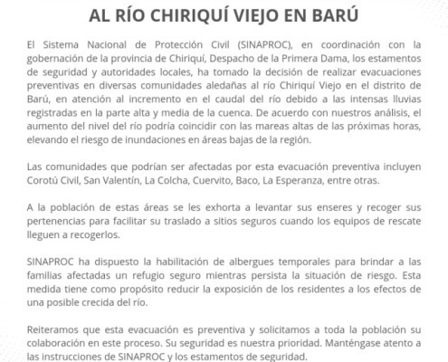El Sistema Nacional de Protección Civil (SINAPROC), en coordinación con la gobernación de la provincia de Chiriquí, los estamentos de seguridad y autoridades locales, ha tomado la decisión de realizar evacuaciones preventivas en diversas…