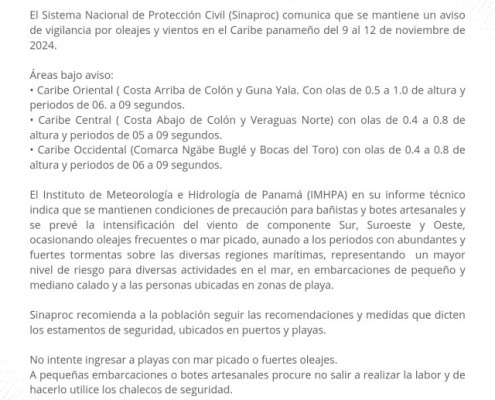 El Sistema Nacional de Protección Civil (Sinaproc) comunica que se mantiene un aviso de vigilancia por oleajes y vientos en el Caribe panameño del 9 al 12 de noviembre de 2024.