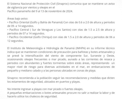 El Sistema Nacional de Protección Civil (Sinaproc) comunica que se mantiene un aviso de vigilancia por vientos y oleajes en el Pacífico panameño del 9 al 13 de noviembre de 2024.