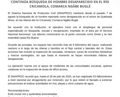 Panamá, 9 de agosto de 2025.- El Sistema Nacional de Protección Civil (SINAPROC) mantiene desde el pasado 7 de agosto la búsqueda de un hombre reportado como desaparecido en el sector de Quebrada Mono, en las riberas del río Cricamola, Comarca…