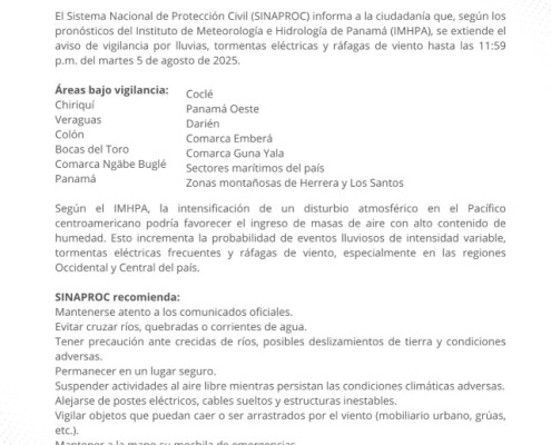 El Sistema Nacional de Protección Civil (SINAPROC) informa a la ciudadanía que, según los pronósticos del Instituto de Meteorología e Hidrología de Panamá (IMHPA), se extiende el aviso de vigilancia por lluvias, tormentas eléctricas…