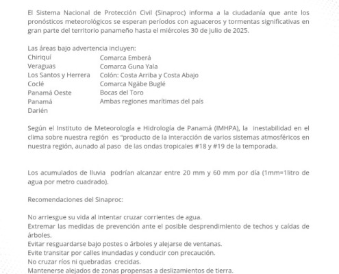 Panamá, 29 de julio de 2025.- El Sistema Nacional de Protección Civil (Sinaproc) informa a la ciudadanía que ante los pronósticos meteorológicos se esperan períodos con aguaceros y tormentas significativas en gran parte del territorio…