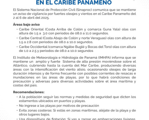 Panamá, 2 de abril del 2025.- El Sistema Nacional de Protección Civil (Sinaproc) comunica que se mantiene un aviso de vigilancia por fuertes oleajes y vientos en el Caribe Panameño del 2 al 6 de abril del 2025.