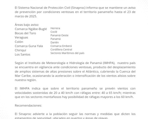 Panamá, 22 de marzo de 2025.- El Sistema Nacional de Protección Civil (Sinaproc) informa que se mantiene un aviso de prevención por condiciones ventosas en el territorio panameño hasta el 23 de marzo de 2025.