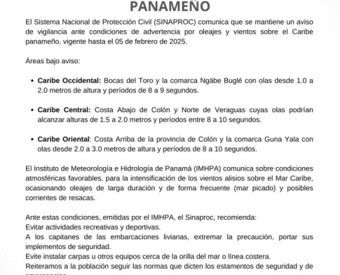 Panamá, 03 de febrero de 2025.- El Sistema Nacional de Protección Civil (SINAPROC) comunica que se mantiene un aviso de vigilancia ante condiciones de advertencia por oleajes y vientos sobre el Caribe panameño, vigente hasta el 05 de febrero…