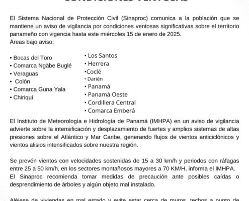 Panamá, 12 de enero de 2025.- El Sistema Nacional de Protección Civil (Sinaproc) comunica a la población que se mantiene un aviso de vigilancia por condiciones ventosas significativas sobre el territorio panameño con vigencia hasta este…