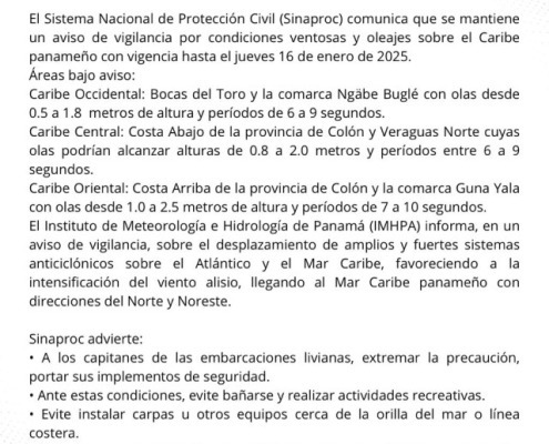 El Sistema Nacional de Protección Civil (Sinaproc) comunica que se mantiene un aviso de vigilancia por condiciones ventosas y oleajes sobre el Caribe panameño con vigencia hasta el jueves 16 de enero de 2025.