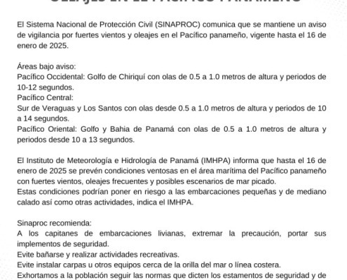 Panamá, 14 de enero de 2025.- El Sistema Nacional de Protección Civil (SINAPROC) comunica que se mantiene un aviso de vigilancia por fuertes vientos y oleajes en el Pacífico panameño, vigente hasta el 16 de enero de 2025.
