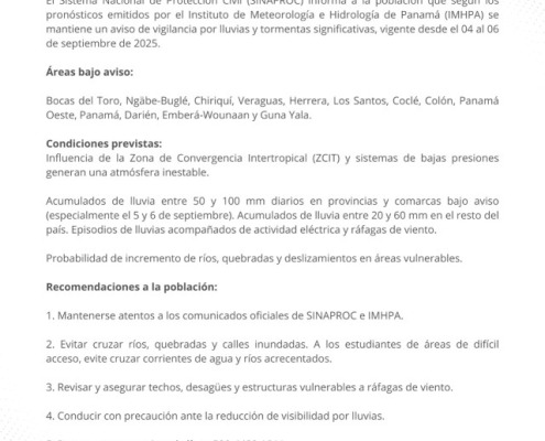 Panamá, 04 de septiembre de 2025.- El Sistema Nacional de Protección Civil (SINAPROC) informa a la población que según los pronósticos emitidos por el Instituto de Meteorología e Hidrología de Panamá (IMHPA) se mantiene un aviso de…