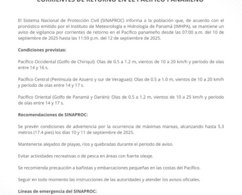 Panamá, 10 de septiembre de 2025.- El Sistema Nacional de Protección Civil (SINAPROC) informa a la población que, de acuerdo con el pronóstico emitido por el Instituto de Meteorología e Hidrología de Panamá (IMHPA), se mantiene un aviso…