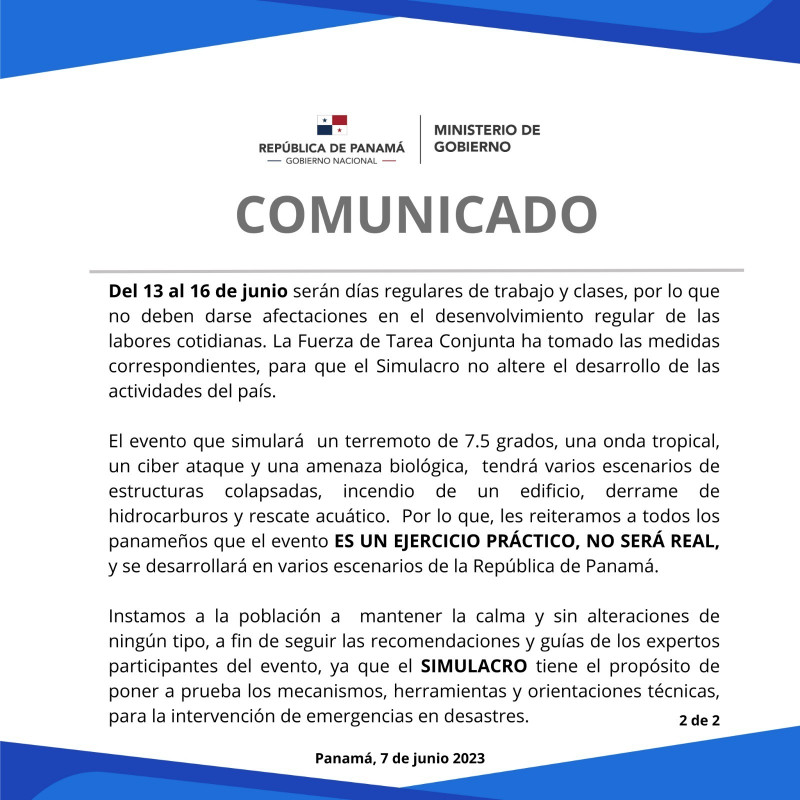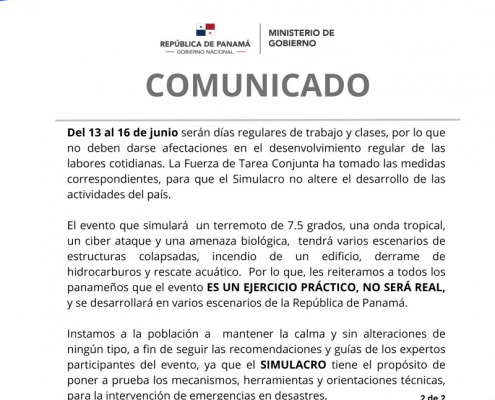 El evento que simulará un terremoto de 7.5 grados, una onda tropical, un ciber ataque y una amenaza biológica, tendrá varios escenarios de estructuras colapsadas, incendio de un edificio, derrame de hidrocarburos y rescate acuático. Por lo que, les reiteramos a todos los panameños que el evento ES UN EJERCICIO PRÁCTICO, NO SERÁ REAL, y se desarrollará en varios escenarios de la República de Panamá.