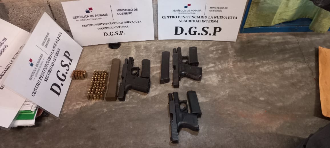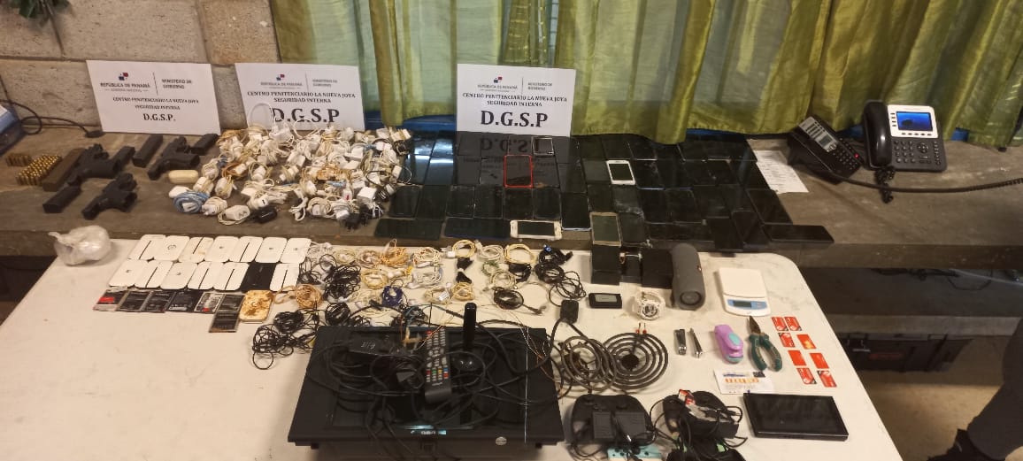 Panamá, 27 de marzo de 2023. – Tres armas de fuego 9 milímetros y calibre 40, tres proveedores, 162 municiones de arma de fuego, presunta sustancia ilícita, celulares, accesorios de celular, entre otros artículos prohibidos, fueron decomisados por custodios penitenciarios en un operativo de requisa que se realizó en el sector B, mediana 1 de La Nueva Joya, informó Euclides Joel Castillo G., director General del Sistema Penitenciario.