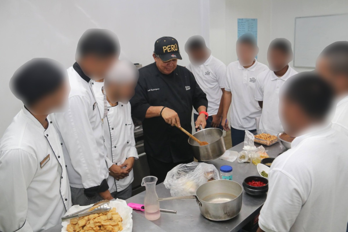 Panamá, 12 de noviembre de 2024. Con el objetivo de brindar una serie de talleres sobre la gastronomía peruana, el embajador de la República de Perú en Panamá, Mario López Chavárri, visitó el Centro de Cumplimiento Las Garzas del Instituto de Estudios Interdisciplinarios (IEI), actividad que incluyó donación de una mesa de cocina y el primer taller sobre esta reconocida comida, a cargo del chef Abel Rodríguez del Restaurante Delicias Peruanas.