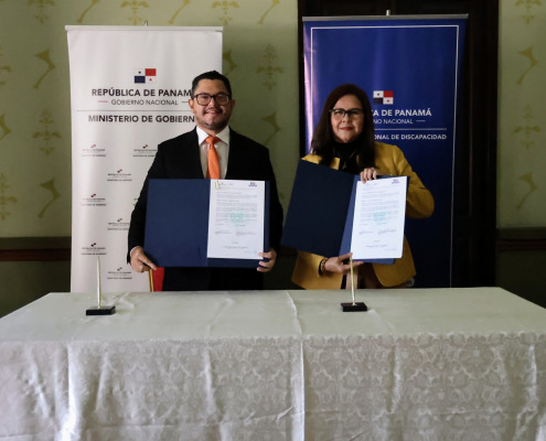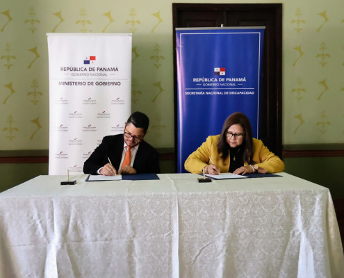 Panamá, 25 de enero de 2023. Con el objetivo de garantizar la ejecución del plan de seguridad para las personas con discapacidad en situaciones de emergencias, encaminado a la reducción de riesgos y atención oportuna de emergencias y desastres de este grupo poblacional; el ministro de Gobierno, Roger Tejada Bryden, y la directora de la Secretaría Nacional de Discapacidad (Senadis), Iris Mercedes González de Valenzuela, firmaron un convenio de cooperación interinstitucional.