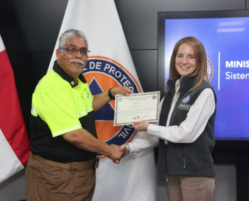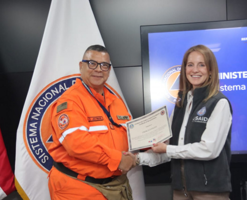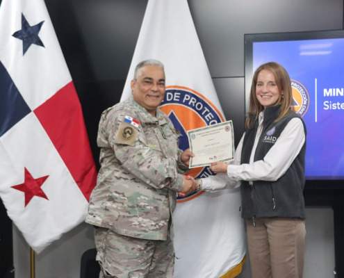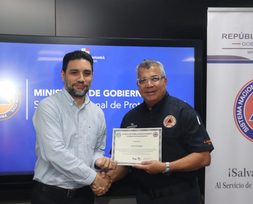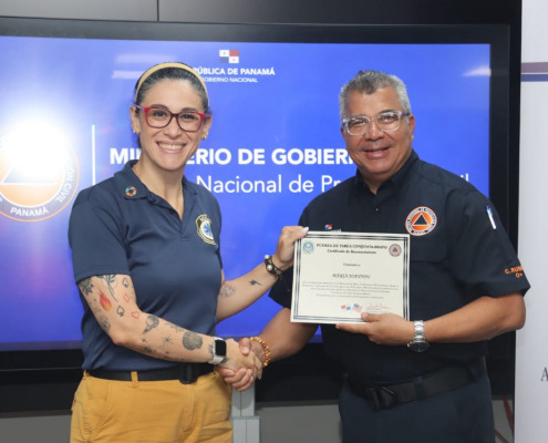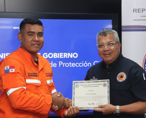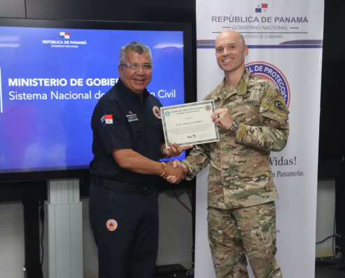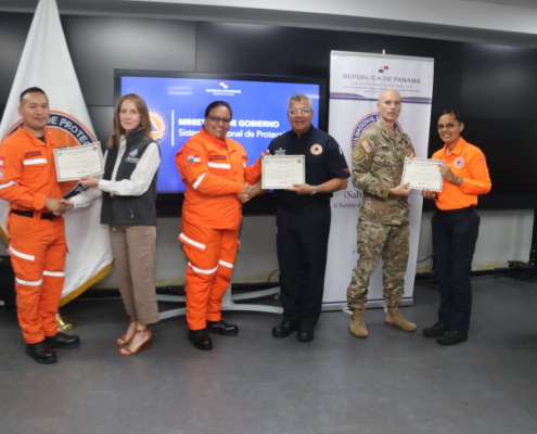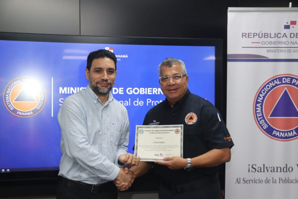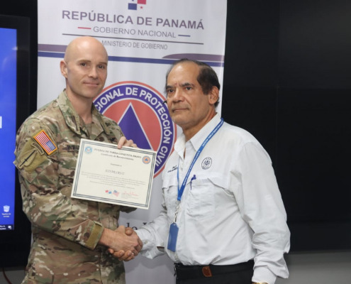 La entrega de certificados fue presidida por el director de la institución, Carlos Rumbo, quien estuvo acompañado del Coronel James Wiese, comandante de la Fuerza de Tarea Conjunto Bravo, quienes coincidieron en la importancia de realizar este tipo de ejercicios que permiten conocer más a fondo cómo se activan los mecanismos de emergencia y cooperación cuando se registren situaciones de desastres que sobre pasen la capacidad operativa del país afectado.