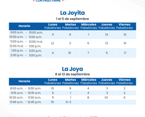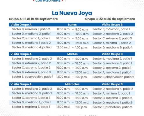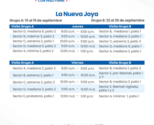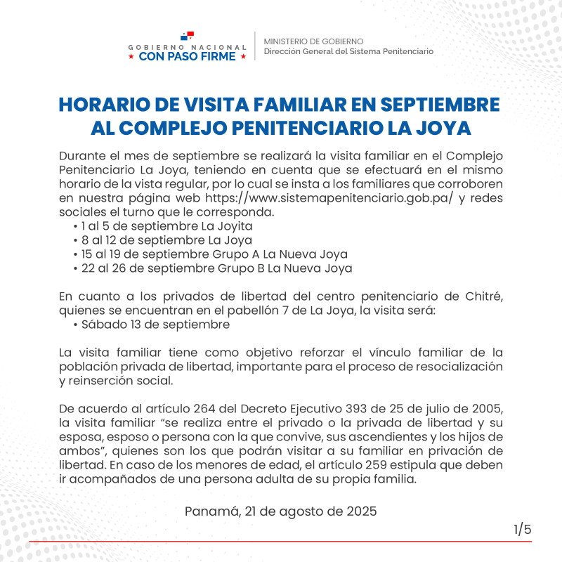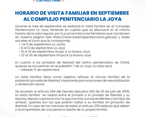 Durante el mes de septiembre se realizará la visita familiar en el Complejo Penitenciario La Joya, teniendo en cuenta que se efectuará en el mismo horario de la vista regular, por lo cual se insta a los familiares que corroboren en nuestra página web https://www.sistemapenitenciario.gob.pa/ y redes sociales el turno que le corresponda.