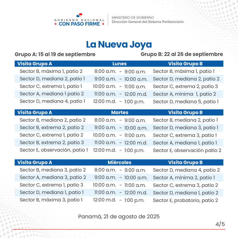 En cuanto a los privados de libertad del centro penitenciario de Chitré, quienes se encuentran en el pabellón 7 de La Joya, la visita será: