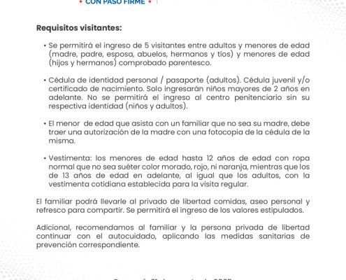 - Se permitirá el ingreso de 5 visitantes entre adultos y menores de edad (madre, padre, esposa, abuelos, hermanos y tíos) y menores de edad (hijos y hermanos) comprobado parentesco.