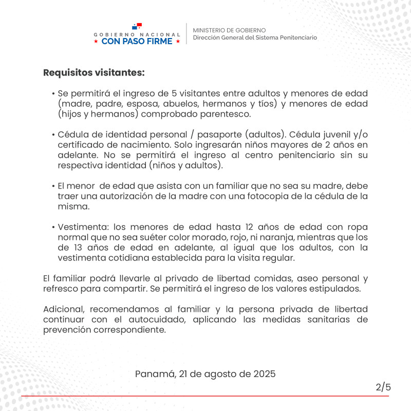 - Cédula de identidad personal / pasaporte (adultos). Cédula juvenil y/o certificado de nacimiento. Solo ingresarán niños mayores de 2 años en adelante. No se permitirá el ingreso al centro penitenciario sin su respectiva identidad (niños y adultos).