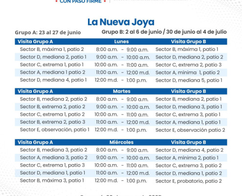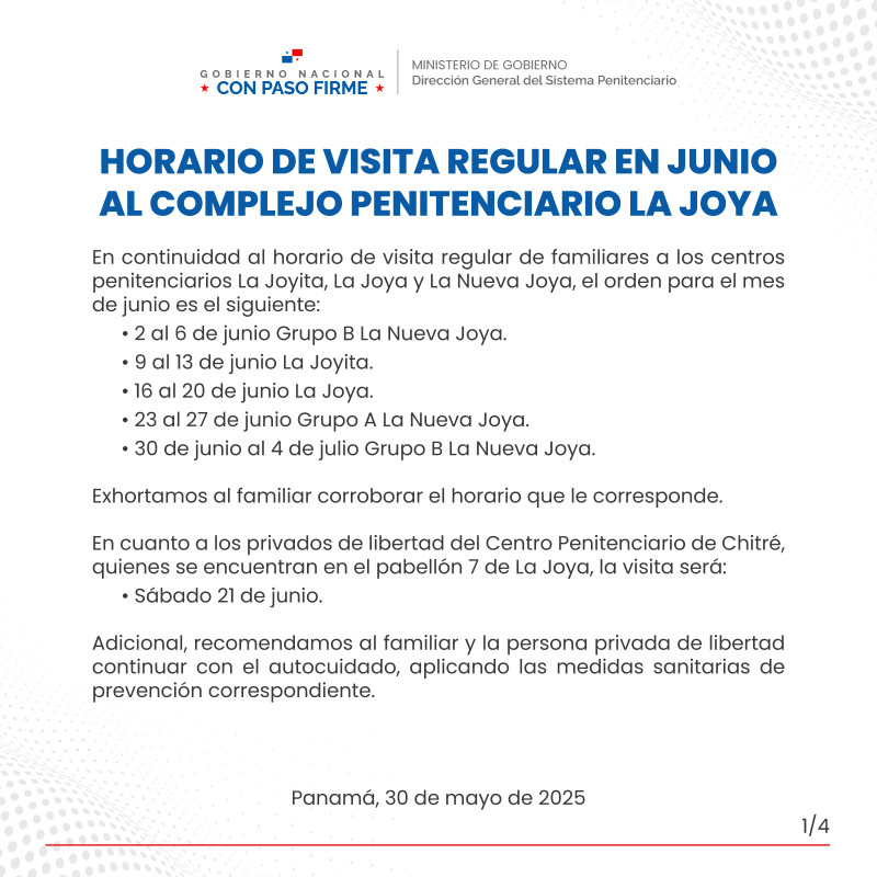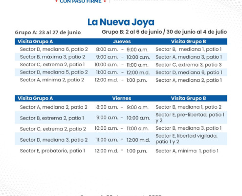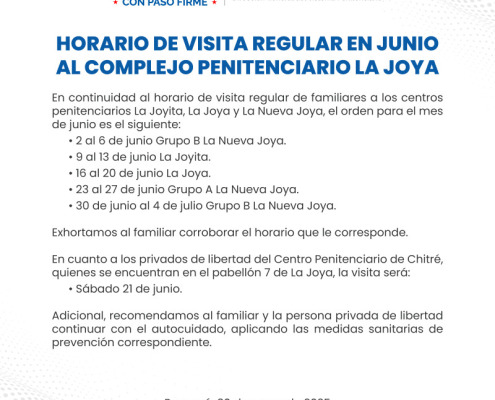En continuidad al horario de visita regular de familiares a los centros penitenciarios La Joyita, La Joya y La Nueva Joya, el orden para el mes de junio es el siguiente: