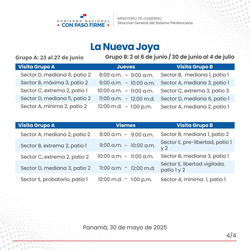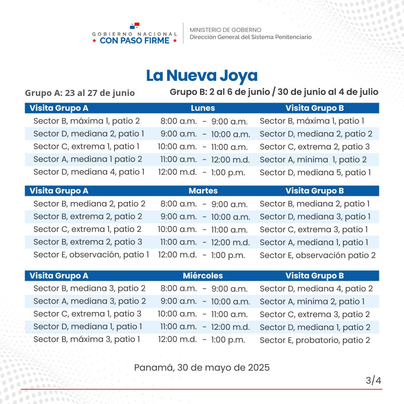 En cuanto a los privados de libertad del Centro Penitenciario de Chitré, quienes se encuentran en el pabellón 7 de La Joya, la visita será: