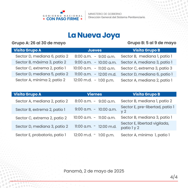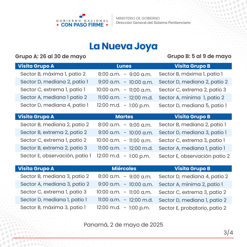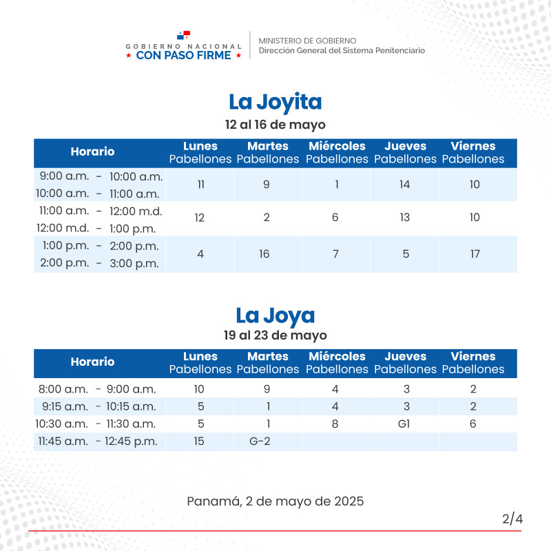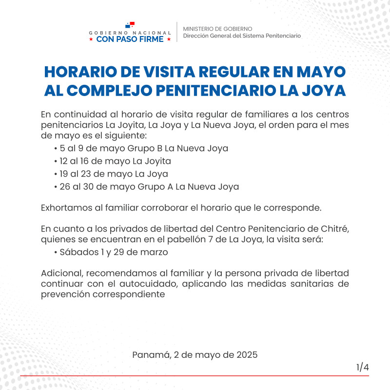 En continuidad al horario de visita regular de familiares a los centros penitenciarios La Joyita, La Joya y La Nueva Joya, el orden para el mes de mayo es el siguiente: