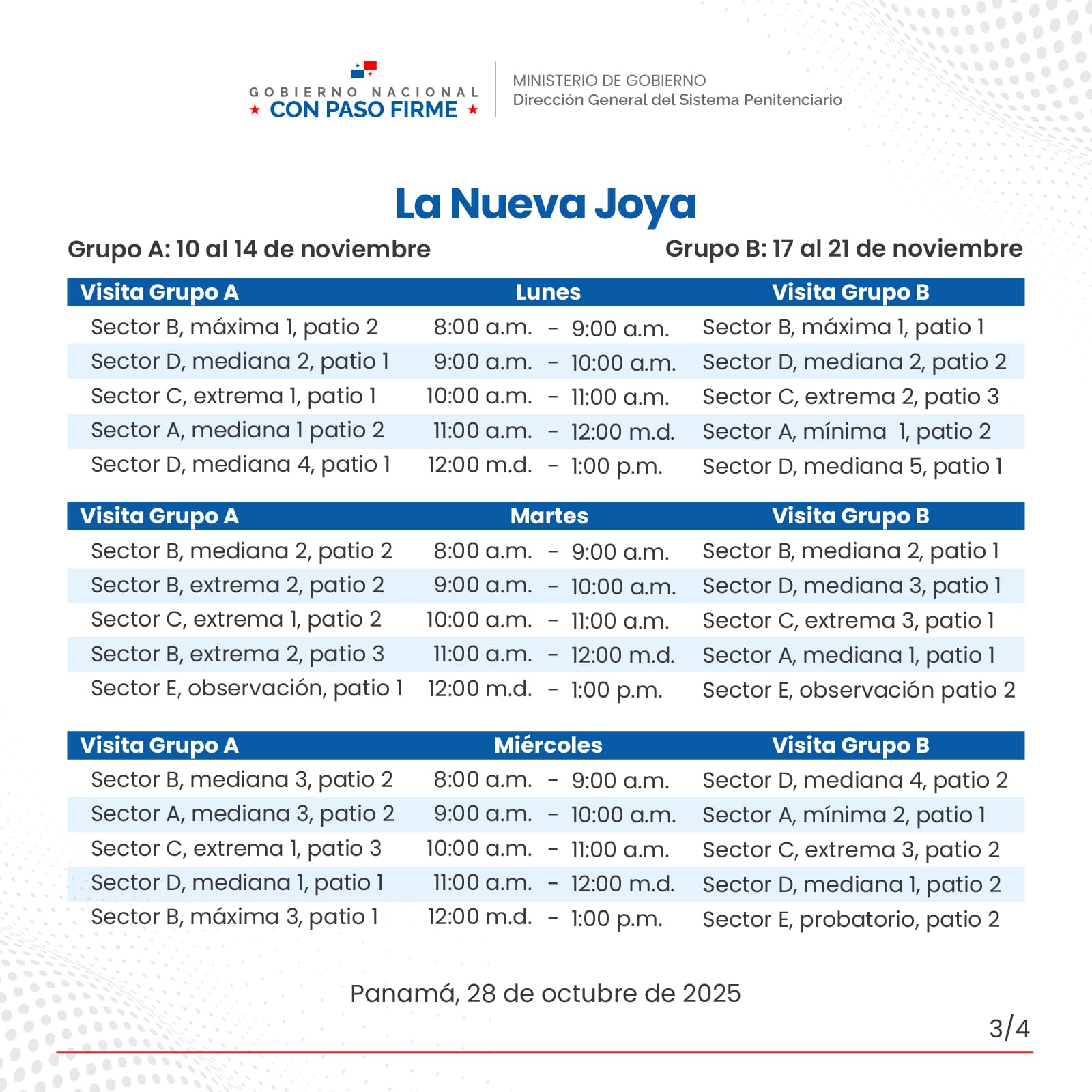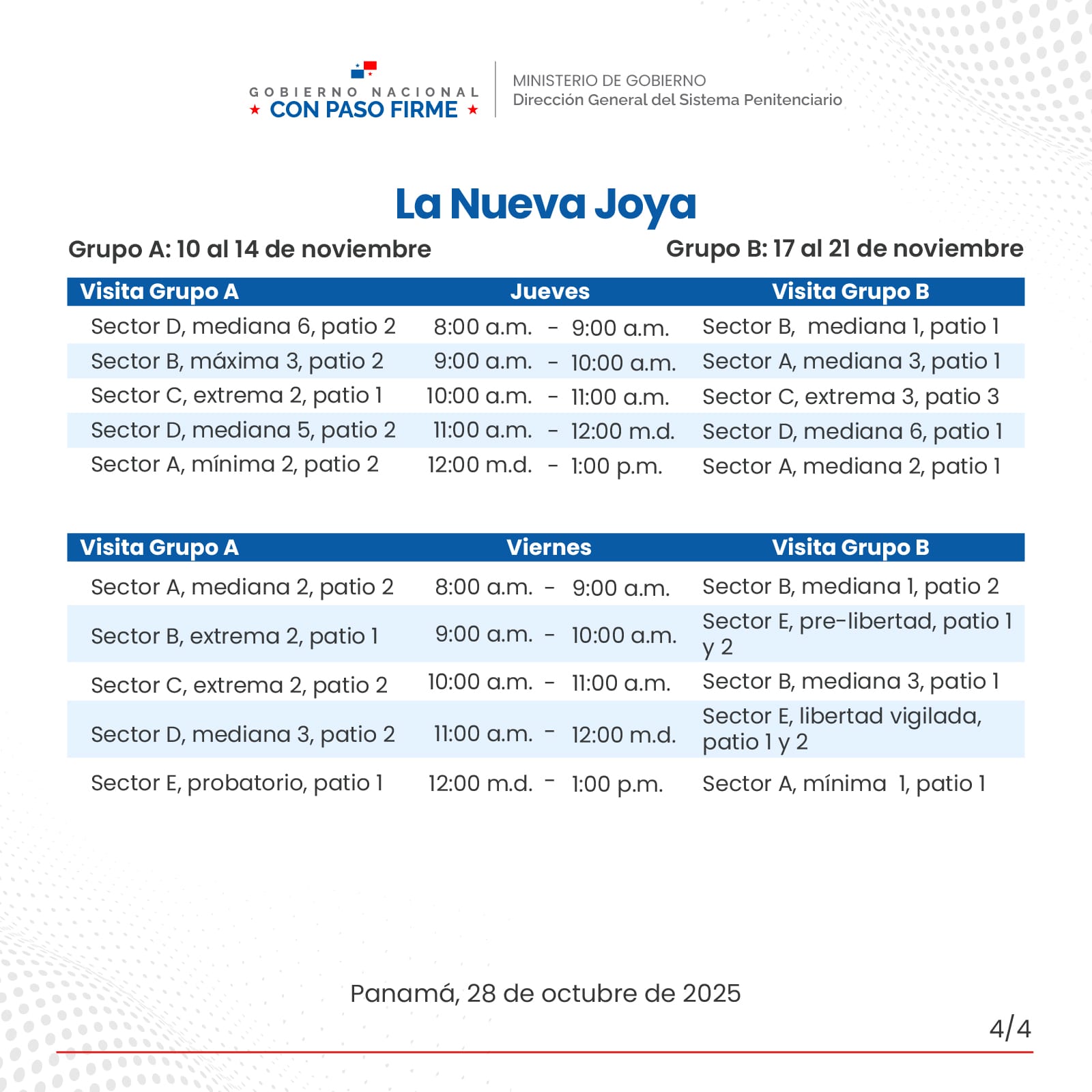 En cuanto a los privados de libertad del Centro Penitenciario de Chitré, quienes se encuentran en el pabellón 7 de La Joya, la visita será: