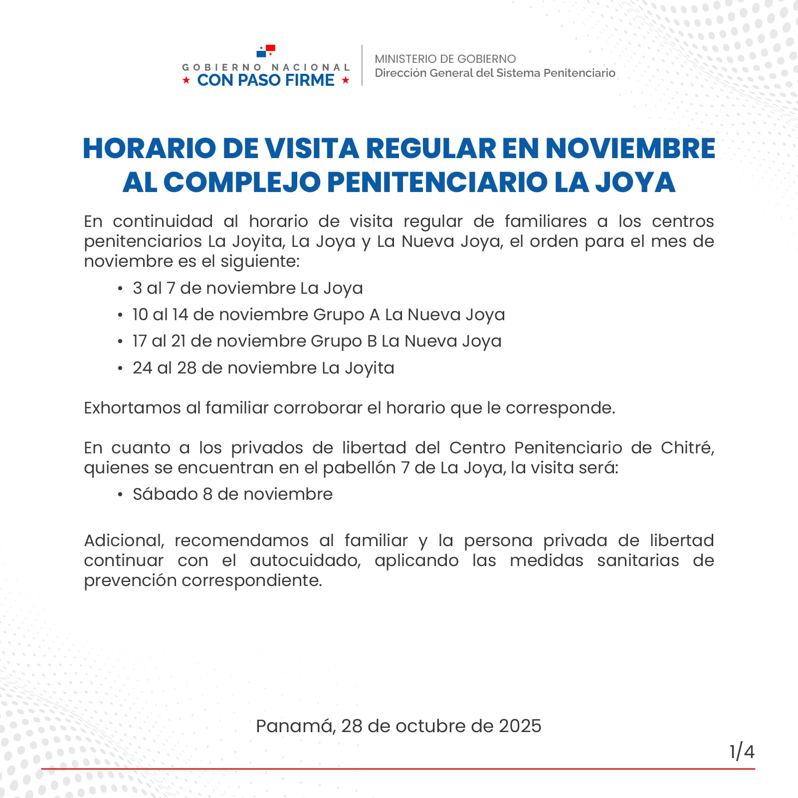 En continuidad al horario de visita regular de familiares a los centros penitenciarios La Joyita, La Joya y La Nueva Joya, el orden para el mes de noviembre es el siguiente: