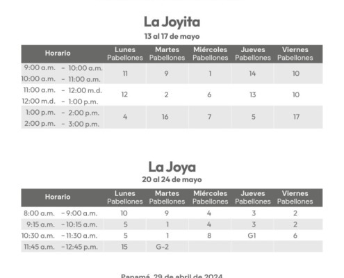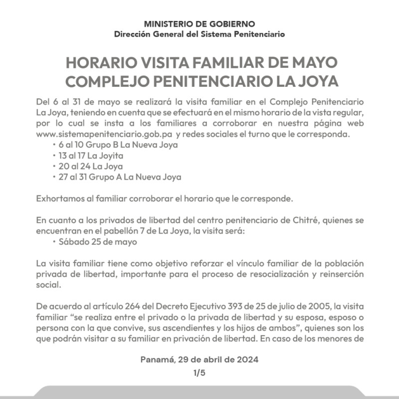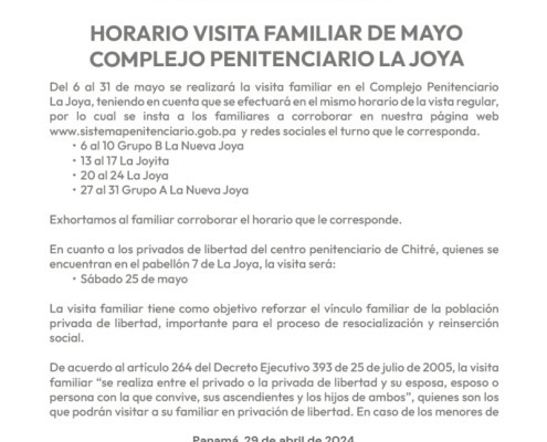 Del 6 al 31 de mayo se realizará la visita familiar en el Complejo Penitenciario La Joya, teniendo en cuenta que se efectuará en el mismo horario de la vista regular, por lo cual se insta a los familiares a corroborar en nuestra página web https://www.sistemapenitenciario.gob.pa/ y redes sociales el turno que le corresponda.