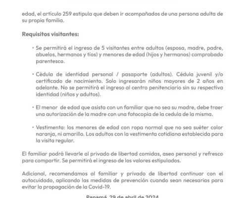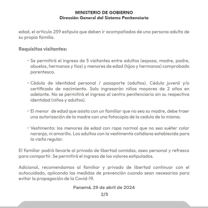 - Cédula de identidad personal / pasaporte (adultos). Cédula juvenil y/o certificado de nacimiento. Solo ingresarán niños mayores de 2 años en adelante. No se permitirá el ingreso al centro penitenciario sin su respectiva identidad (niños y adultos).