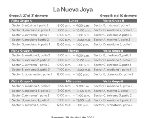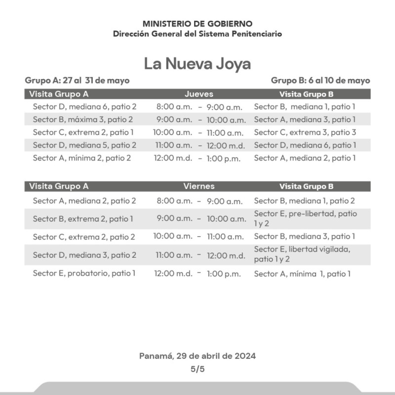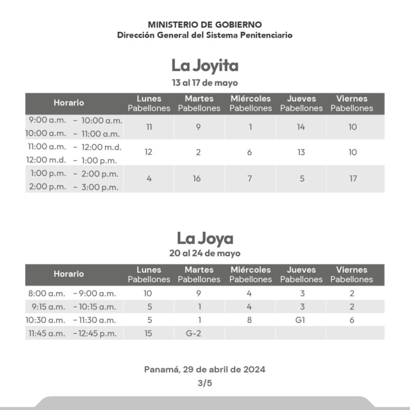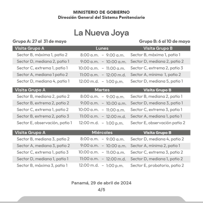 En cuanto a los privados de libertad del centro penitenciario de Chitré, quienes se encuentran en el pabellón 7 de La Joya, la visita será: