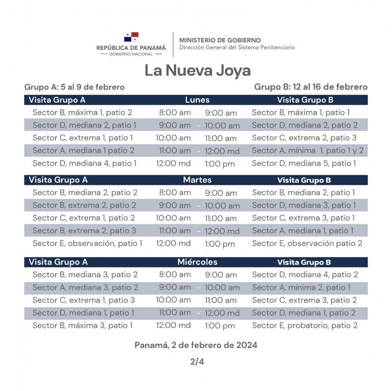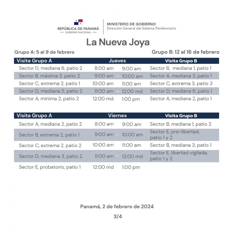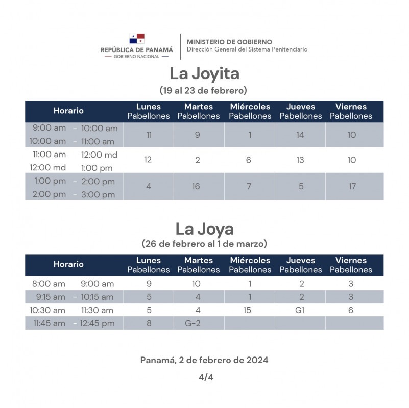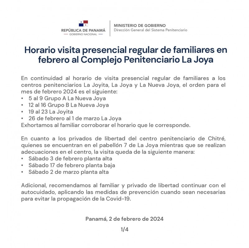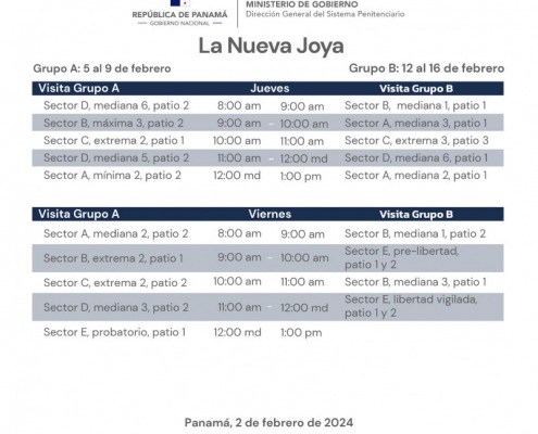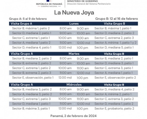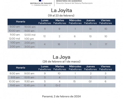 En continuidad al horario de visita presencial regular de familiares a los centros penitenciarios La Joyita, La Joya y La Nueva Joya, el orden para el mes de febrero 2024 es el siguiente: