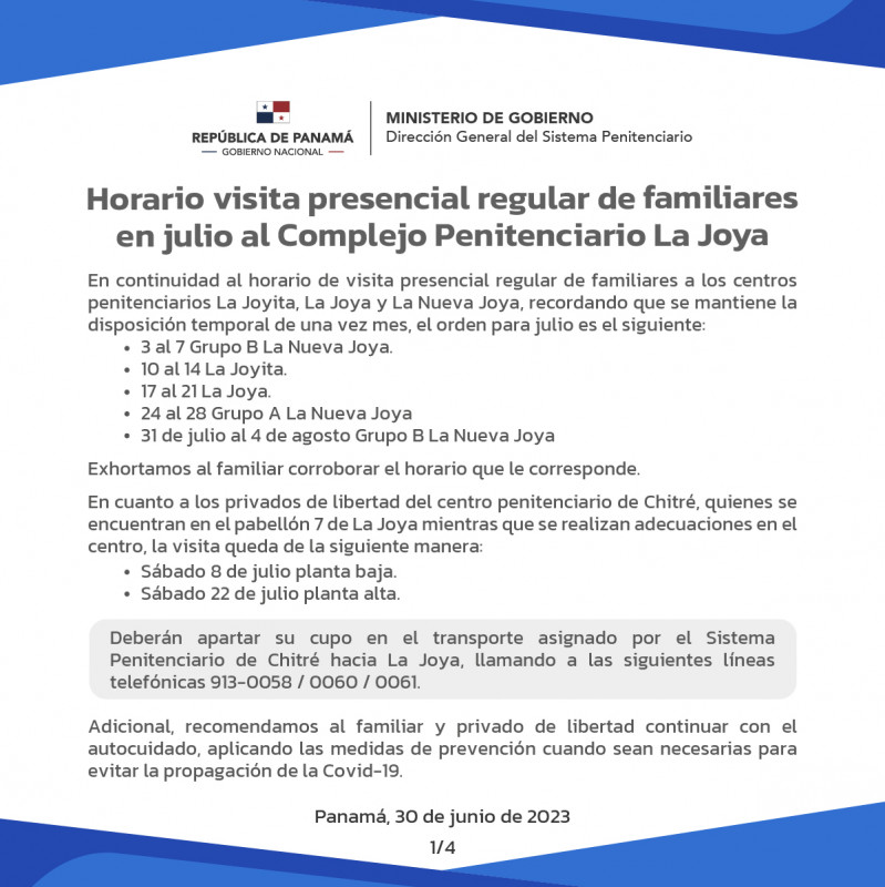 En continuidad al horario de visita presencial regular de familiares a los centros penitenciarios La Joyita, La Joya y La Nueva Joya, recordando que se mantiene la disposición temporal de una vez mes, el orden para julio es el siguiente: