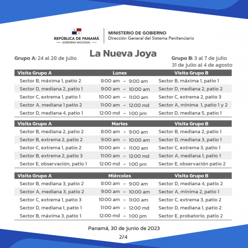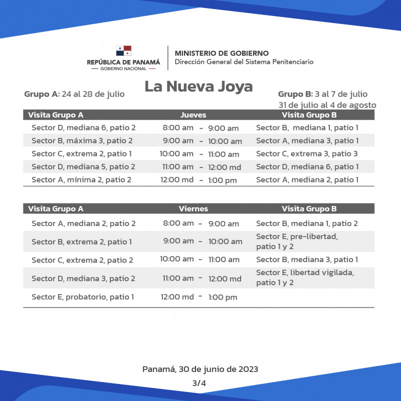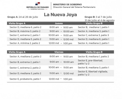 En cuanto a los privados de libertad del centro penitenciario de Chitré, quienes se encuentran en el pabellón 7 de La Joya mientras que se realizan adecuaciones en el centro, la visita queda de la siguiente manera: