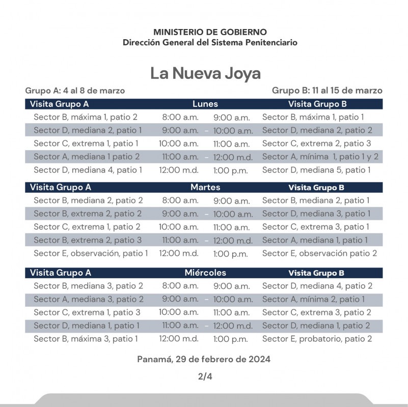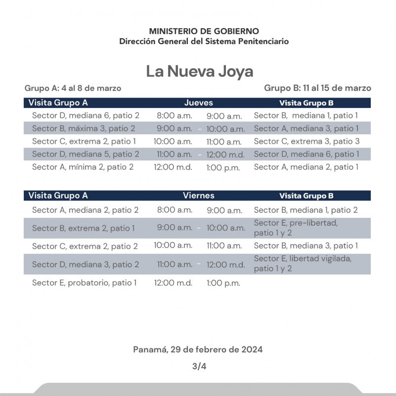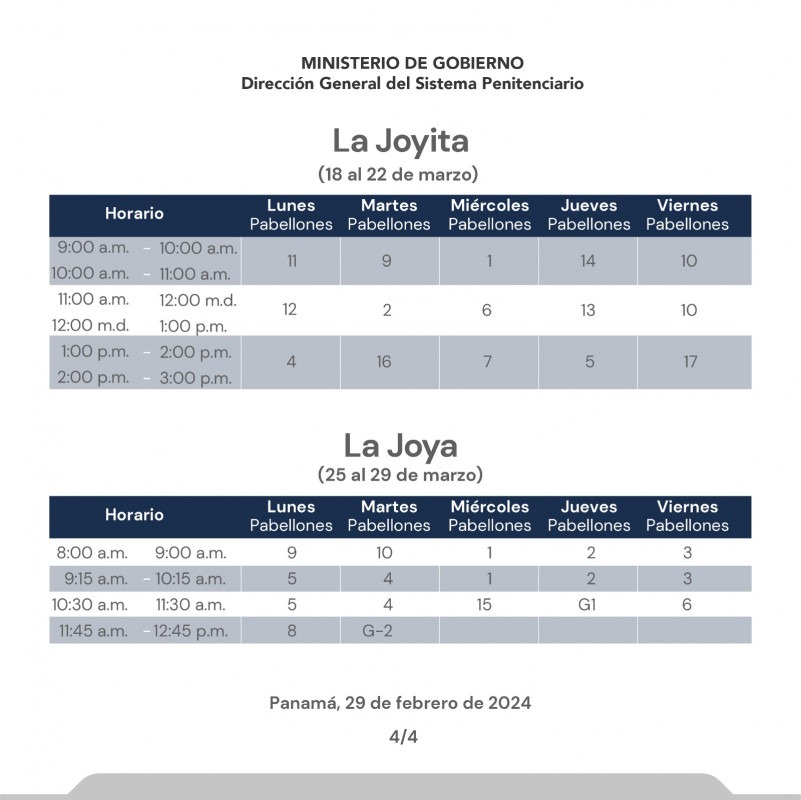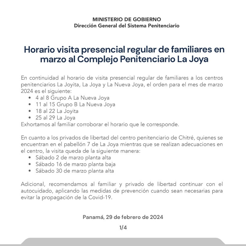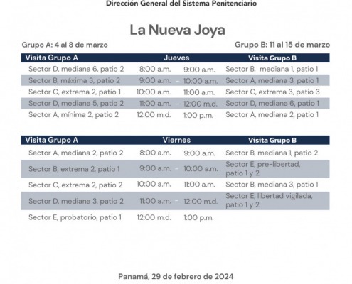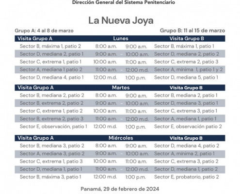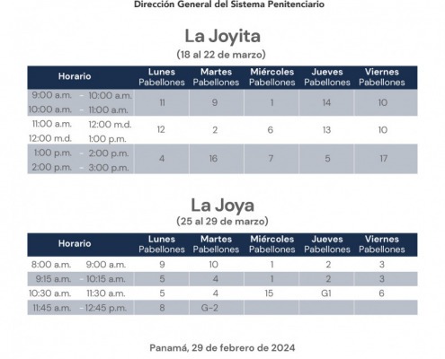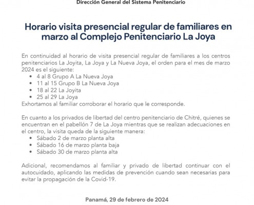 Panamá, 29 de febrero de 2024. — En continuidad al horario de visita presencial regular de familiares a los centros penitenciarios La Joyita, La Joya y La Nueva Joya, el orden para el mes de marzo 2024 es el siguiente: