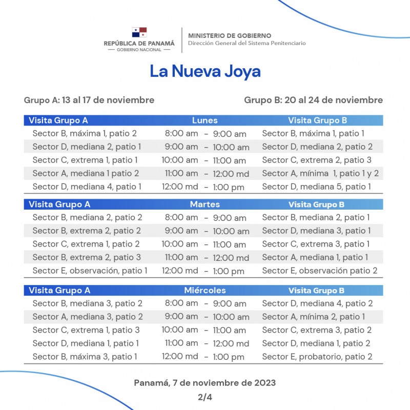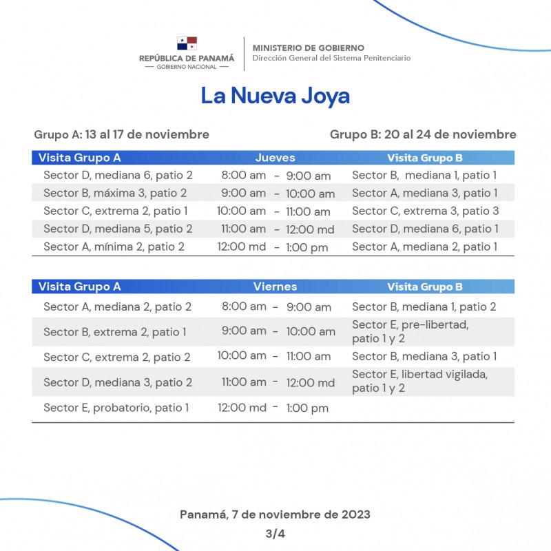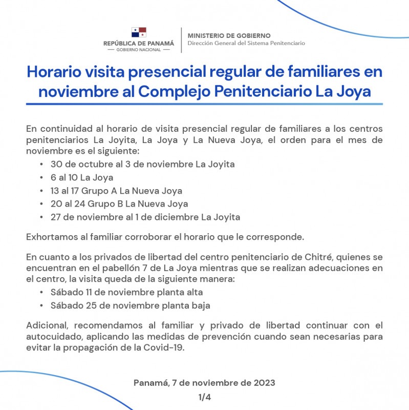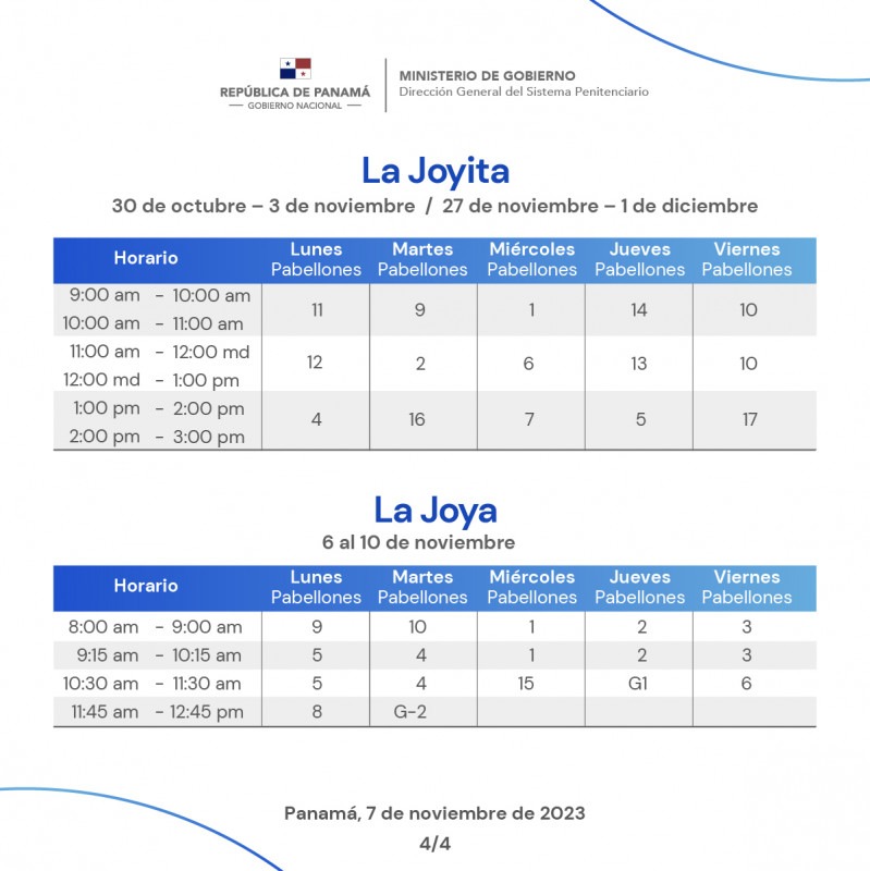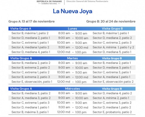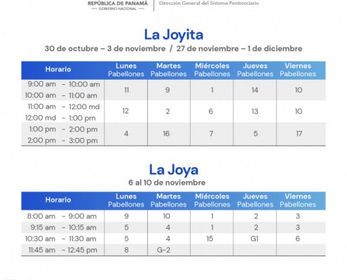 En continuidad al horario de visita presencial regular de familiares a los centros penitenciarios La Joyita, La Joya y La Nueva Joya, el orden para el mes de noviembre es el siguiente: