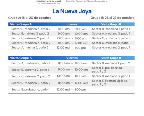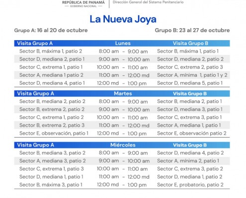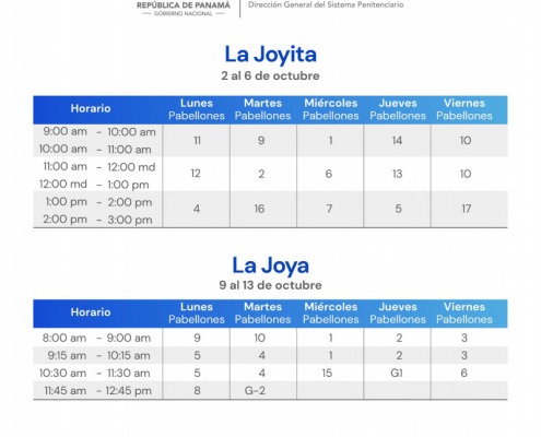 En continuidad al horario de visita presencial regular de familiares a los centros penitenciarios La Joyita, La Joya y La Nueva Joya, recordando que se mantiene la disposición temporal de una vez al mes, el orden para el mes de octubre es el siguiente: