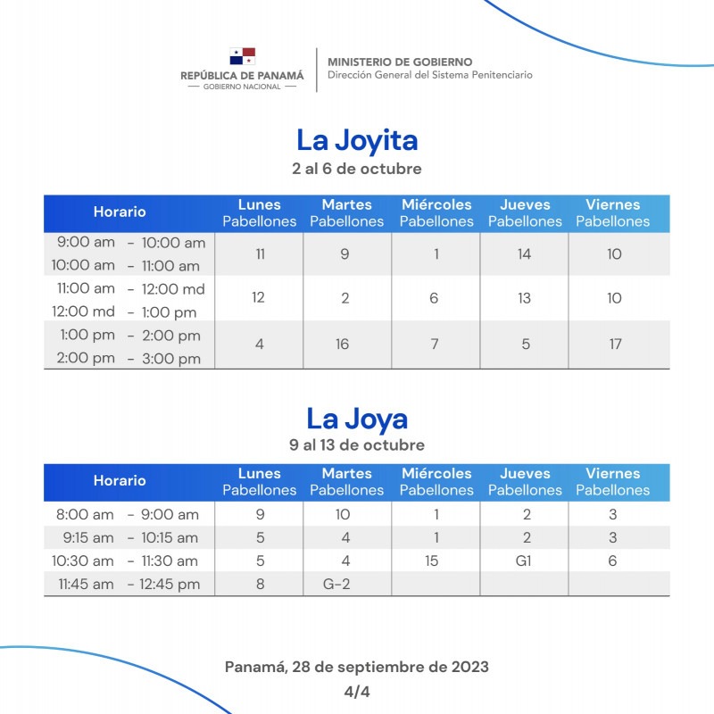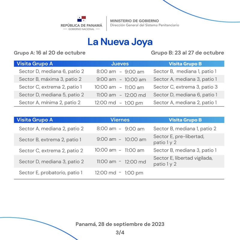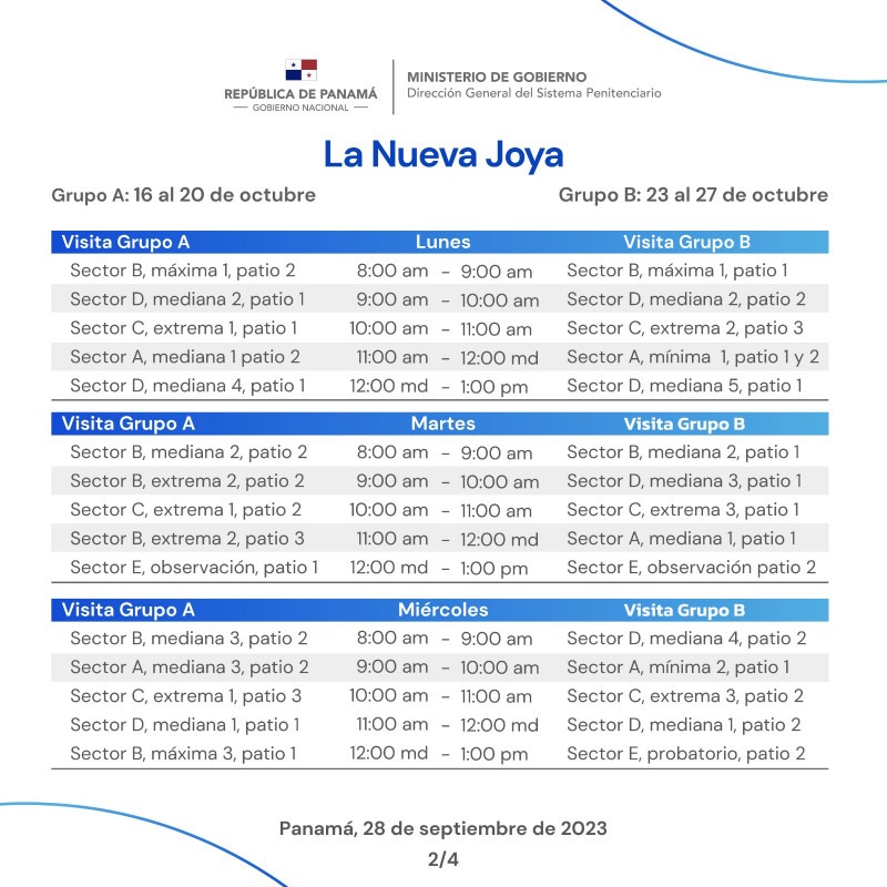 En cuanto a los privados de libertad del centro penitenciario de Chitré, quienes se encuentran en el pabellón 7 de La Joya mientras que se realizan adecuaciones en el centro, la visita queda de la siguiente manera: