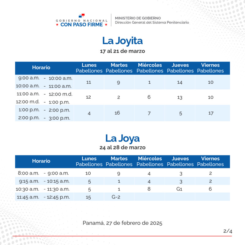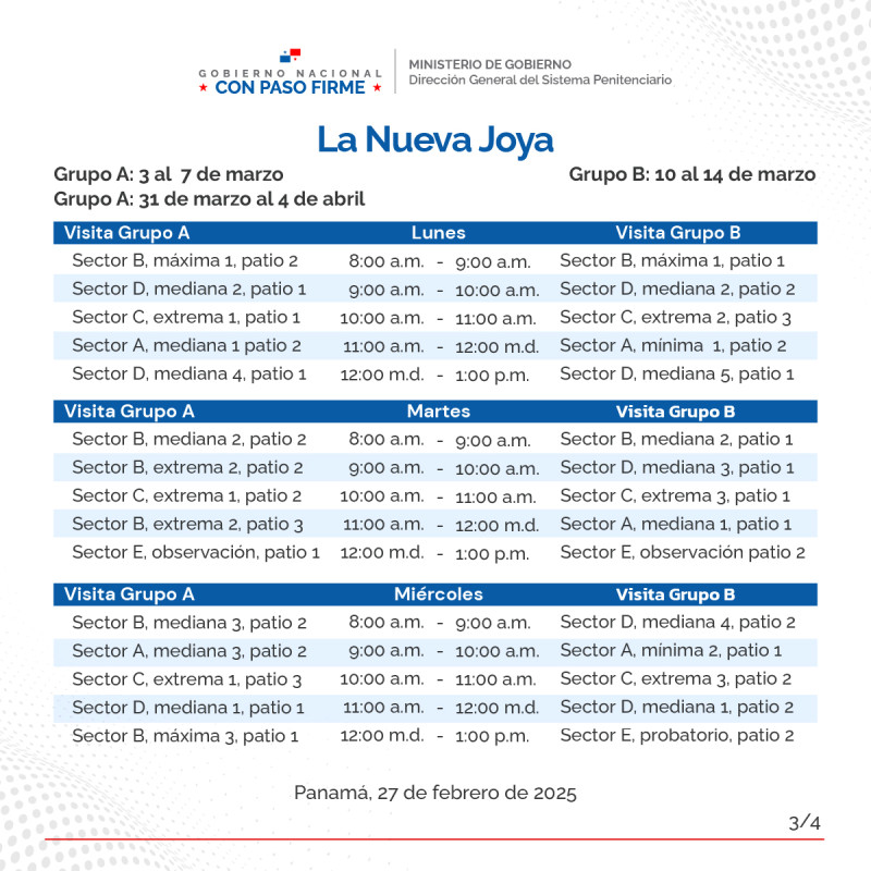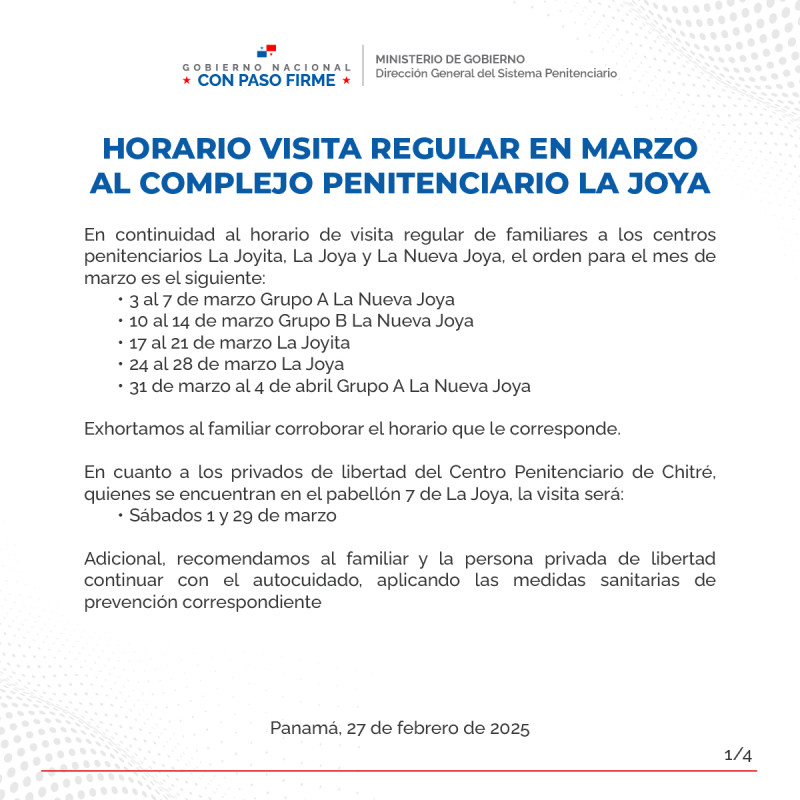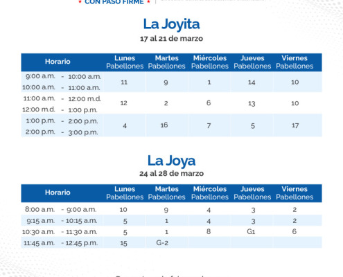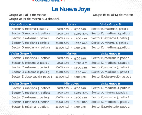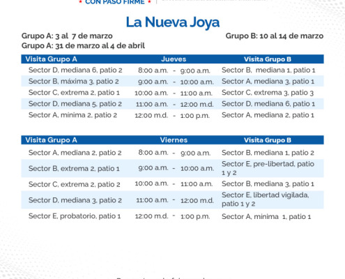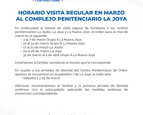 En continuidad al horario de visita regular de familiares a los centros penitenciarios La Joyita, La Joya y La Nueva Joya, el orden para el mes de marzo es el siguiente: