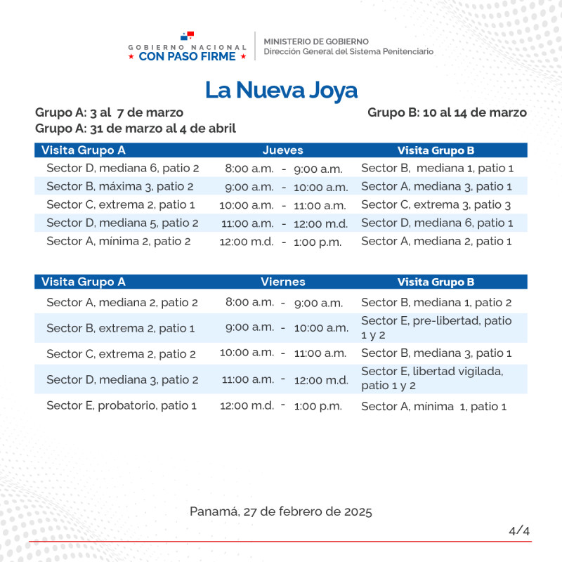En cuanto a los privados de libertad del Centro Penitenciario de Chitré, quienes se encuentran en el pabellón 7 de La Joya, la visita será: