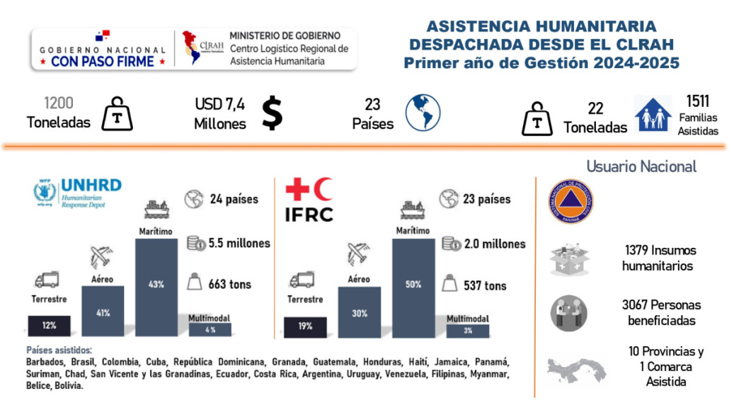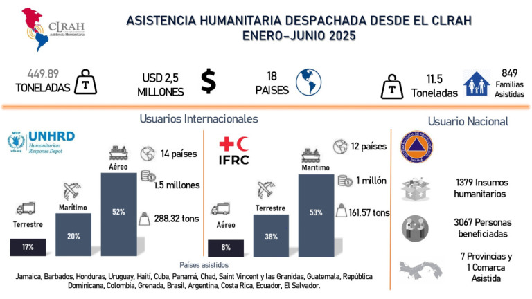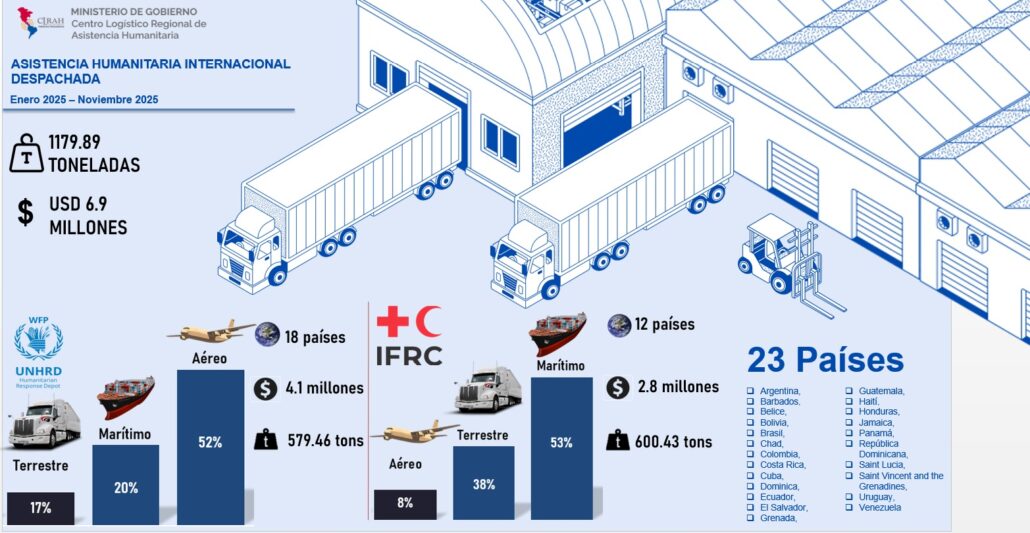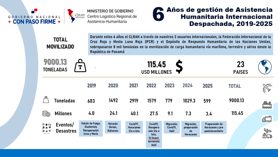 Estadísticas de la movilización de carga Humanitaria despachada desde el CLRAH Enero - Noviembre 2025 Adjuntos Movimiento de carga humanitaria primer año de gestión (523 kB)Movilizacion de carga ENE-JUNIO2025 (661 kB)Movilizacion de carga ENE-MAR2025 (717 kB)Movilizacion de carga internacional 2024 (419 kB)Carga dic 2024 (1014 kB)2024 MOVILIZACIÓN DE CARGA INTERNACIONAL 2024 Ene - Abr (889 kB)MOVILIZACIÓN DE CARGA INTERNACIONAL Ene-Dic 2023 (878 kB)Infografía CLRAH en Imagenes (Enero - Noviembre 2022) (671 kB)Infografía CLRAH en Imagenes (Enero-Dic 2021) salida (687 kB)Infografía CLRAH en Imagenes_Movimiento de Carga Humanitaria Internacional enero-diciembre 2020 (416 kB)