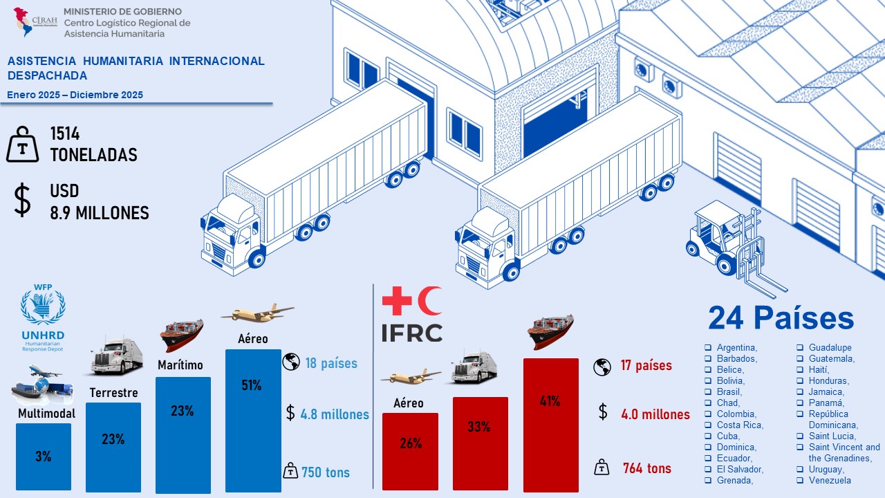 Estadísticas de la movilización de carga Humanitaria despachada desde el CLRAH Enero - Diciembre 2025 Adjuntos Movimiento de carga humanitaria primer año de gestión (523 kB)Movilizacion de carga ENE-JUNIO2025 (661 kB)Movilizacion de carga ENE-MAR2025 (717 kB)Movilizacion de carga internacional 2024 (419 kB)Carga dic 2024 (1014 kB)2024 MOVILIZACIÓN DE CARGA INTERNACIONAL 2024 Ene - Abr (889 kB)MOVILIZACIÓN DE CARGA INTERNACIONAL Ene-Dic 2023 (878 kB)Infografía CLRAH en Imagenes (Enero - Noviembre 2022) (671 kB)Infografía CLRAH en Imagenes (Enero-Dic 2021) salida (687 kB)Infografía CLRAH en Imagenes_Movimiento de Carga Humanitaria Internacional enero-diciembre 2020 (416 kB)