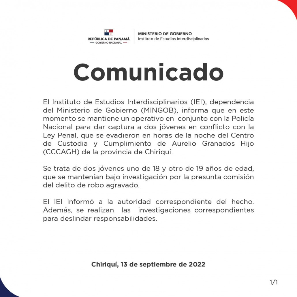 Chiriquí, 13 de septiembre de 2022. – El Instituto de Estudios Interdisciplinarios (IEI), dependencia del Ministerio de Gobierno (MINGOB), informa […]
