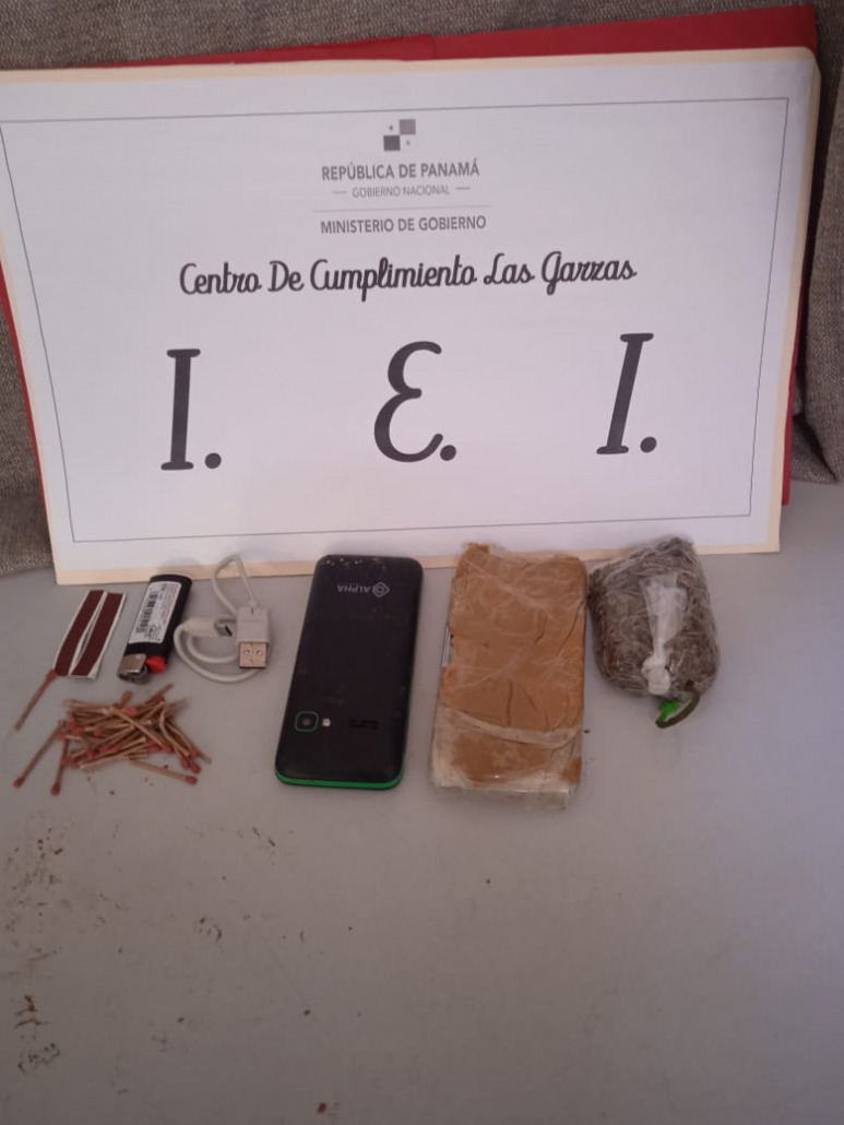 Panamá 2 de noviembre de 2022. Envoltorios con presunta marihuana, un celular, cable USB, fósforos y un encendedor fueron decomisados por los custodios del Instituto de Estudios Interdisciplinarios (IEI) en el Centro de Cumplimiento de Las Garzas (CCLG), tras escuchar el vuelo del artefacto no tripulado en horas de la noche.