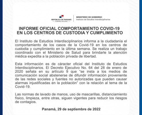 Informe Oficial Comportamiento Covid-19 en los Centros de Custodia y Cumplimiento 29 de septiembre 2022