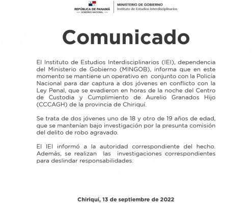 Chiriquí, 13 de septiembre de 2022. – El Instituto de Estudios Interdisciplinarios (IEI), dependencia del Ministerio de Gobierno (MINGOB), informa que en este momento se mantiene un operativo en conjunto con la Policía Nacional para dar…
