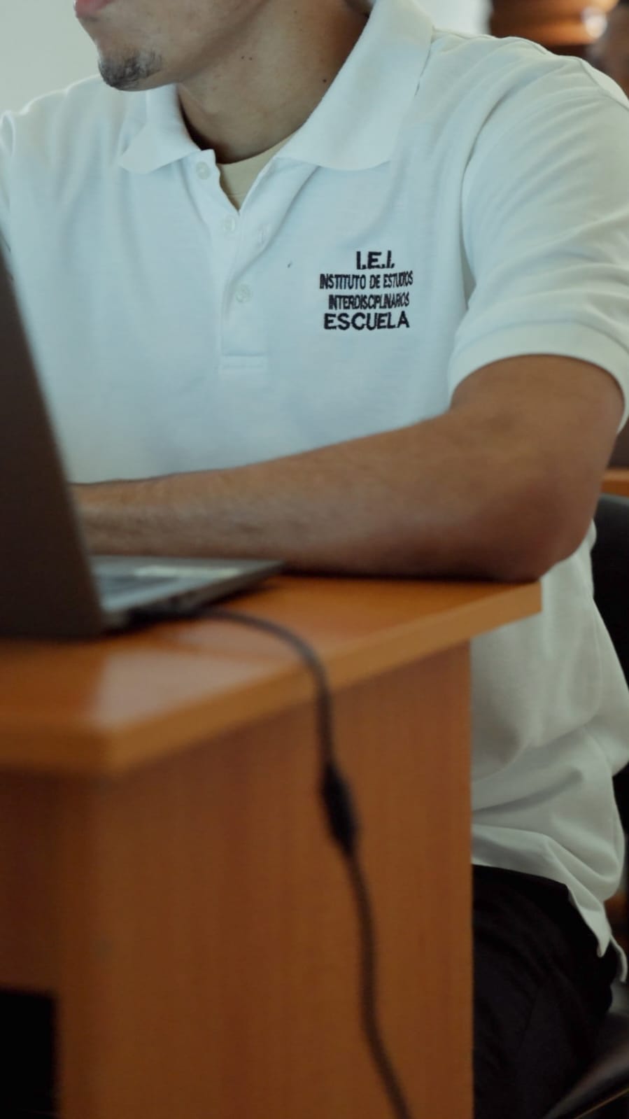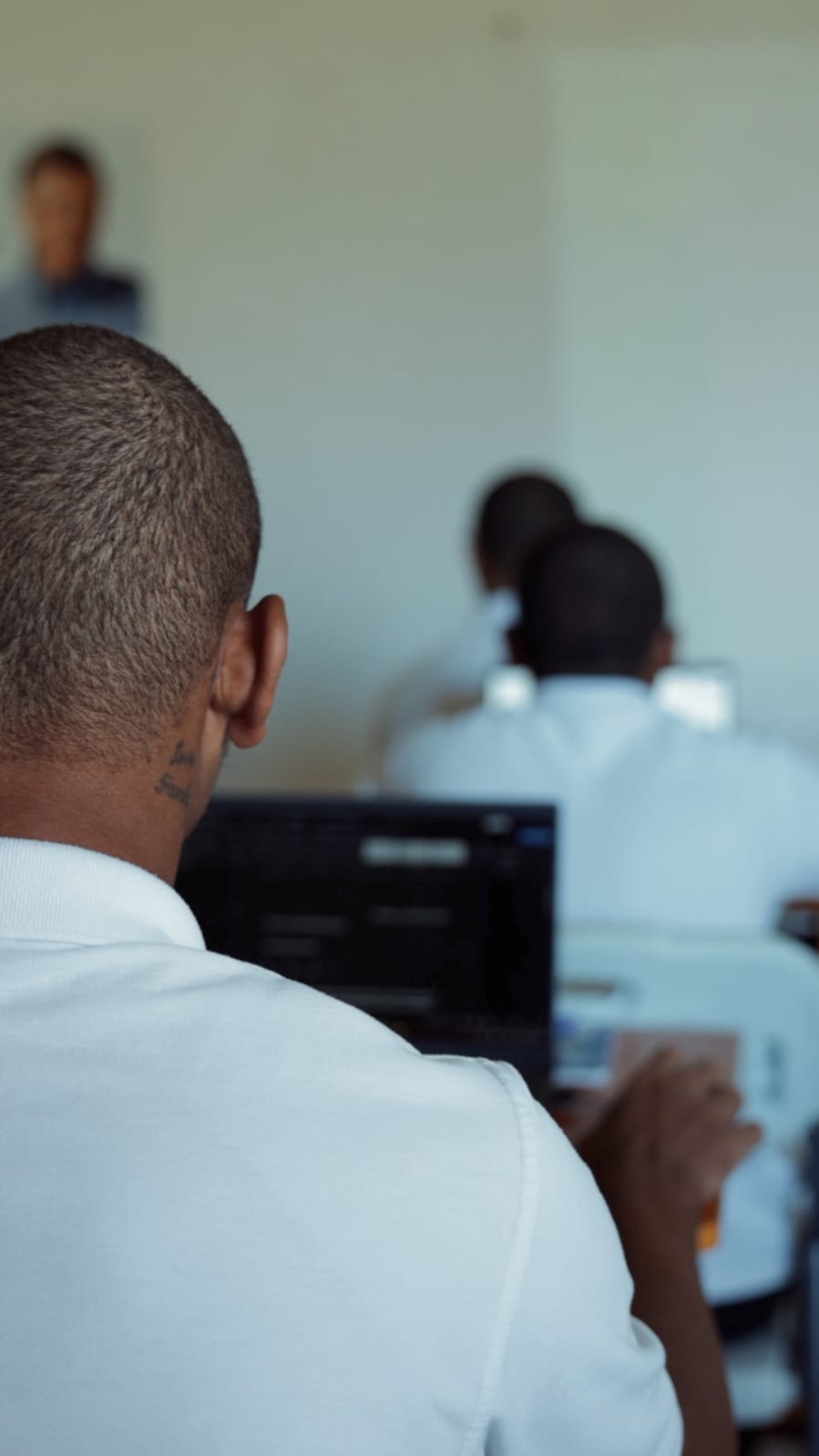 Uniformados con suéter blanco y pantalón negro, los estudiantes inician su jornada en el aula, sentados frente a sus escritorios con laptops, donde ponen en práctica los conocimientos teóricos y prácticos que reciben durante cada sesión.