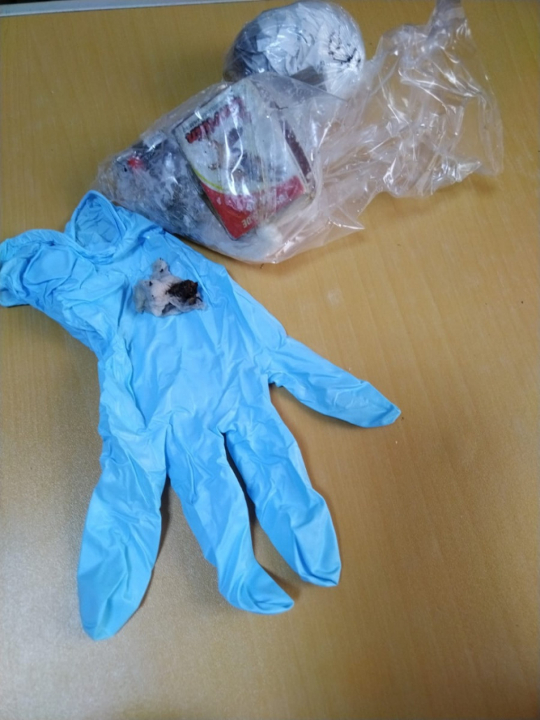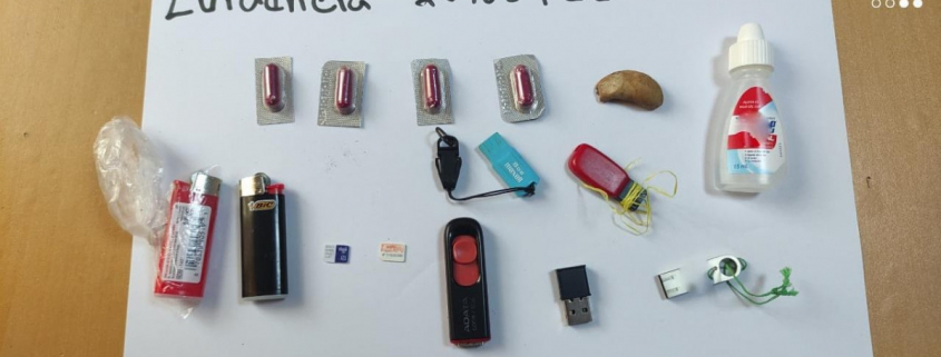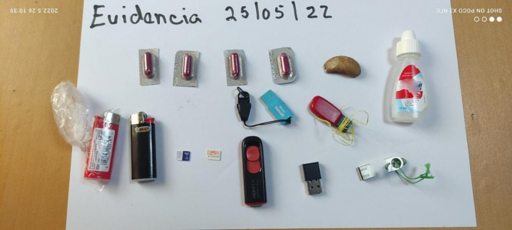Panamá, 27 de mayo de 2022. Presunta sustancia vegetal ilícita, papel “feeling” que se usa para envolver cigarrillos, encendedores, celulares, memorias USB, cargadores, hojas de afeitar, “chips”, botella con vinagre, gotas para la irritación ocular y aguja de metal fueron algunos de los implementos ilícitos encontrados mediante requisa efectuada en las Fases de Desempeño y Reinserción Social del Centro de Custodia y Cumplimiento de Herrera (CCCH).