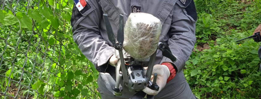 Panamá, 6 de mayo de 2022. Un dron y un envoltorio chocolate cubierto con plástico transparente portador de presunta marihuana incautaron las unidades de custodios del Centro de Cumplimiento de Las Garzas (CCLG), en horas del mediodía mientras efectuaban el recorrido perimetral.