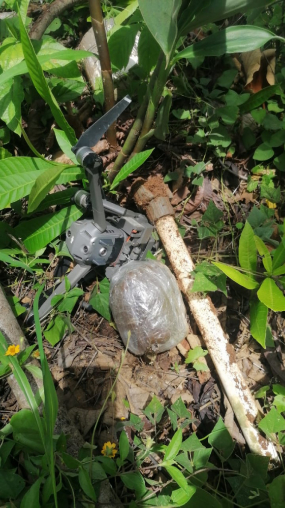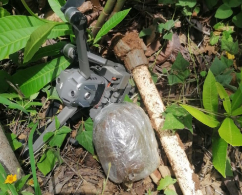 Al realizar la ronda de vigilancia rutinaria, pudieron percatarse de la presencia del artefacto que intentaba introducir por vía aérea el paquete con supuesta sustancia ilícita, aterrizando de manera abrupta sobre el área cercana a la granja avícola, donde se procedió con su incautación.